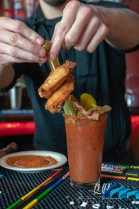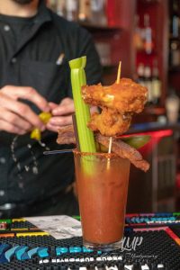 Side note: I ordered a Bloody Mary, and just let me tell you, this was THE Bloody Mary of ALL Bloody Marys!This thing came fully loaded with two tasty & well cooked chicken wings, smoked bacon, an olive, a celery stalk, a pepper, AND a pickle! I’m very picky about my Bloody Marys, and this one looked too good to not try. So I did….I did not regret it.